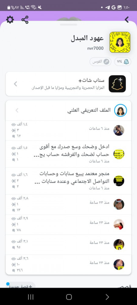 بيع حساب سناب شات توصل مشاهداته 3000 مشاهده وقابل للزياده مع التفاعل بالحساب مفعل فيه خيار صانع محتوى نفس المشاهير